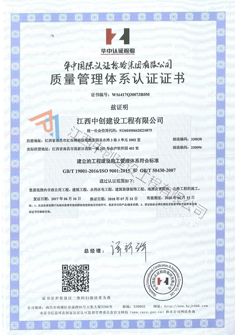 江西中創建設工程有限公司成立于2007年,是以建筑施工、建筑勞務和房地產開發為三大支柱,同時具建筑工程一級、市政工程一級、環保工程一級、地質災害治理甲級、裝飾裝修一級、建筑智能化一級以及水利水電、公路橋梁、機電設備安裝以及鋼結構、特種專業加固、公路養護等一體...【查看詳情】